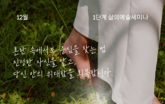 삶의예술세미나 1월 ~ 3월 일정 어튠먼트 워크숍 장소: 연희동 서울센터(주소는 신청 후 개별 알림) 참가비: 처음 참가: 4.5만원 | 재참가: 3.5만원 | 세미나 수료자: 2.5만원 | 프랙티셔너 : 무료(기버 참여) 상세내용: https://forms.gle/rVN9uwWHJexYZVX69 _@삶의예술세미나 <맛보기> 워크숍@_ 2박3일의 세미나의 밀도를 다 담을 수는 없지만, 삶의예술세미나의 핵심내용을 조금이라도 이해하고 경험할 수 있도록 3시간을 알차게 구성했습니다. + 주요내용 1. 아름다움의 한 순간 나눔 2. 참을 듣는 2가지 방법 3. 7개 층의 정체성 탐구 4. 삶의예술세미나 Q&A + 일시 2월 1일(토) 오후 2시~5시(3시간) + 장소: 서울센터 + 참가비: 4.5만원 + 대상: 삶의예술세미나에 관..